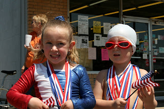 This year Nana Robin came up with the brilliant idea that Jack and Brynnley should show off their USA Olympic pride by dressing as a gymnast and the notorious Michael Phelps, respectively. And, for the first year ever, they won their age division and were each awarded eight tickets to be used at the fair! Even though we (the parents and grandparents) were so proud,